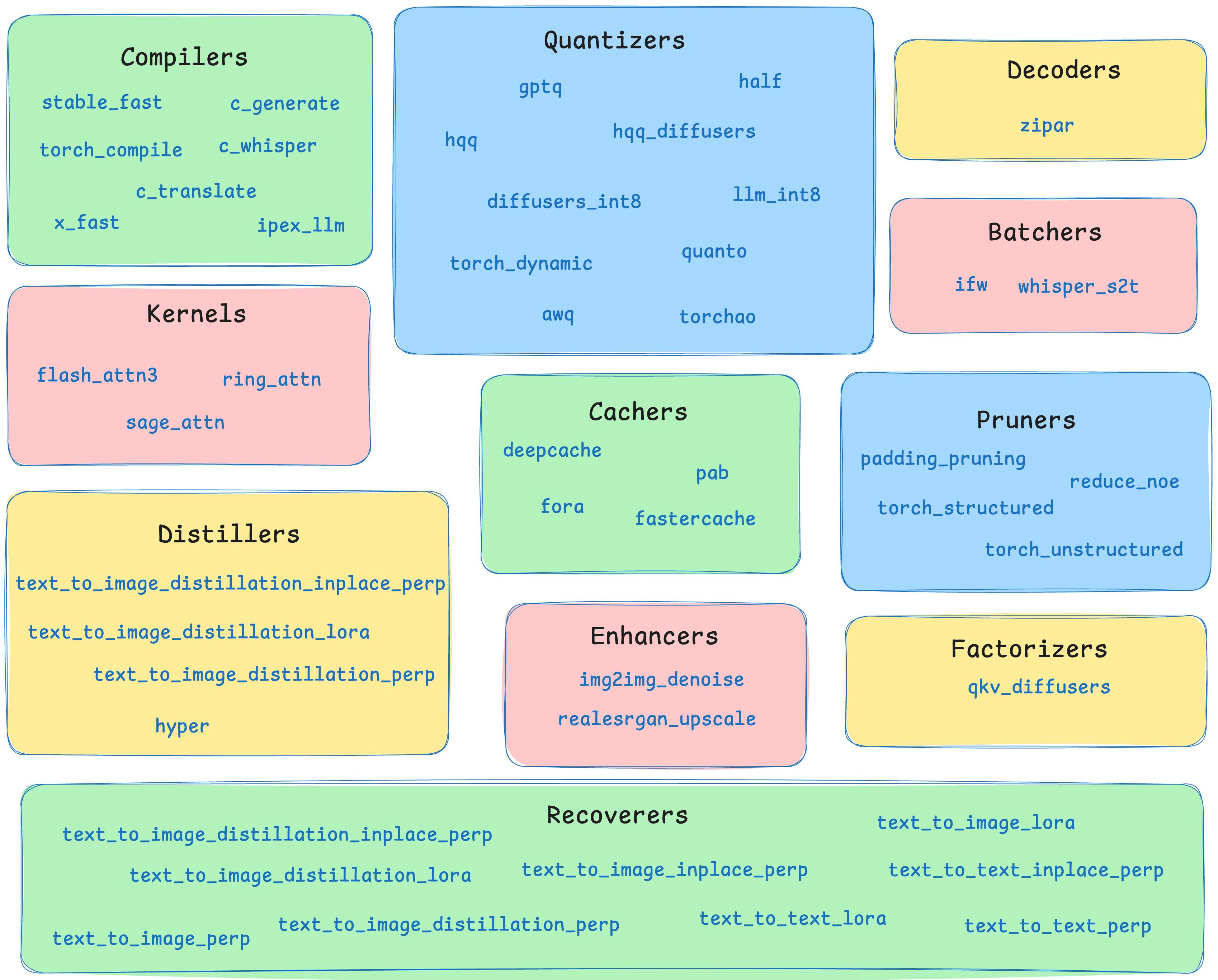 New algorithms and families: Pruna 0.3.2 adds a broad new set of optimization building blocks to the OSS stack. This includes new compilers, kernels, pruners, and entire new algorithm families such as Decoders, Distillers, Enhancers, and Recoverers.